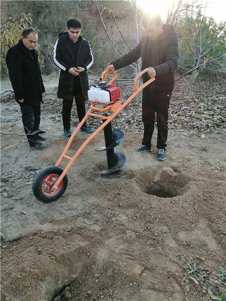 手提挖坑機是由小型汽油機攜帶,減速機,鉆頭,油門控制系統(tǒng),操作手柄等組成的鉆孔機型。分為單人操作式和雙人操作式。由人工手提前行,機器產(chǎn)生動力,減速機旋轉(zhuǎn),油門控制速度,鉆頭旋轉(zhuǎn),刀片削土,鉆尖定位,螺旋葉片進行出土作業(yè)的機器,單人操作式一般配置40CM或以下的鉆頭;雙人操作式是配置45CM或以下的鉆頭;配置鉆頭越大,選擇動力也要求要加大,這樣才能高效快速的完成鉆孔作業(yè)。要求鉆孔速度每小時不低于100個,測式合格,此款機器大大的節(jié)省勞動力,以手搖式啟動,操作非常簡單,上山植樹再也不怕挖坑。