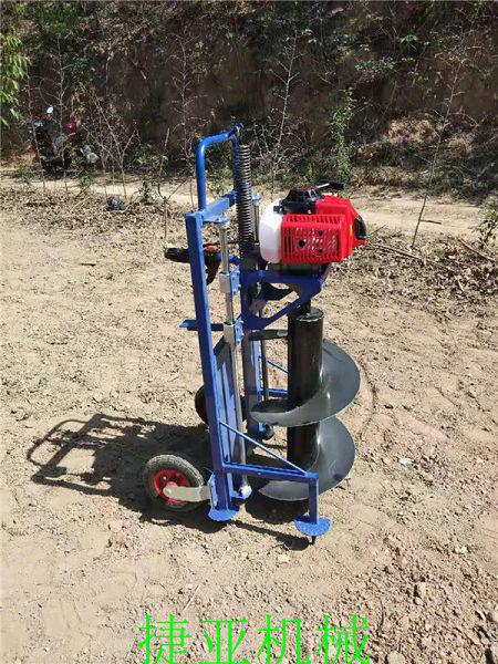 手提式挖坑機由發(fā)動機、離心式離合器、減速器、鉆頭和操縱手柄等構(gòu)成。發(fā)動機一般為單缸二沖程小型汽油機,功率約在2.2~3.68kW。發(fā)動機與挖坑機的其它裝置裝配成一整體,由單人或雙人手持操作。發(fā)動機產(chǎn)生的動力經(jīng)離心式離合器和減速器使螺旋鉆頭按一定速度轉(zhuǎn)動。鉆頭上的刀片水平切削上壤,土塊在旋轉(zhuǎn)的螺旋面上被松碎、升運到地面并被拋到坑周圍。鉆頭工作所需的軸向進給力山機器重量和操作者施加在機器上的力組成。鉆頭工作時產(chǎn)生的反力矩用人體平衡。
